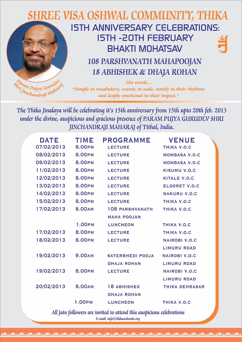 Param Pujya Munishri Jinchandraji Maharaj of Tithal will grace this auspicious occasion. The flag hoisting with the 18 Abhishekhs of the five Murtis will take place on Wednesday 20/2/2013.